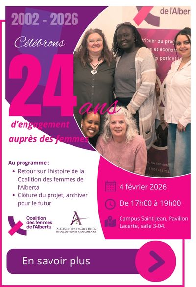 La Coalition des Femmes de l’Alberta est un organisme à but non lucratif, unique organisme voué à la cause des femmes francophones à travers la province. La Coalition des femmes de l’Alberta intervient dans différents secteurs d’importance stratégique. Elle entreprend et développe différents projets et activités en lien avec son mandat et sa vision.